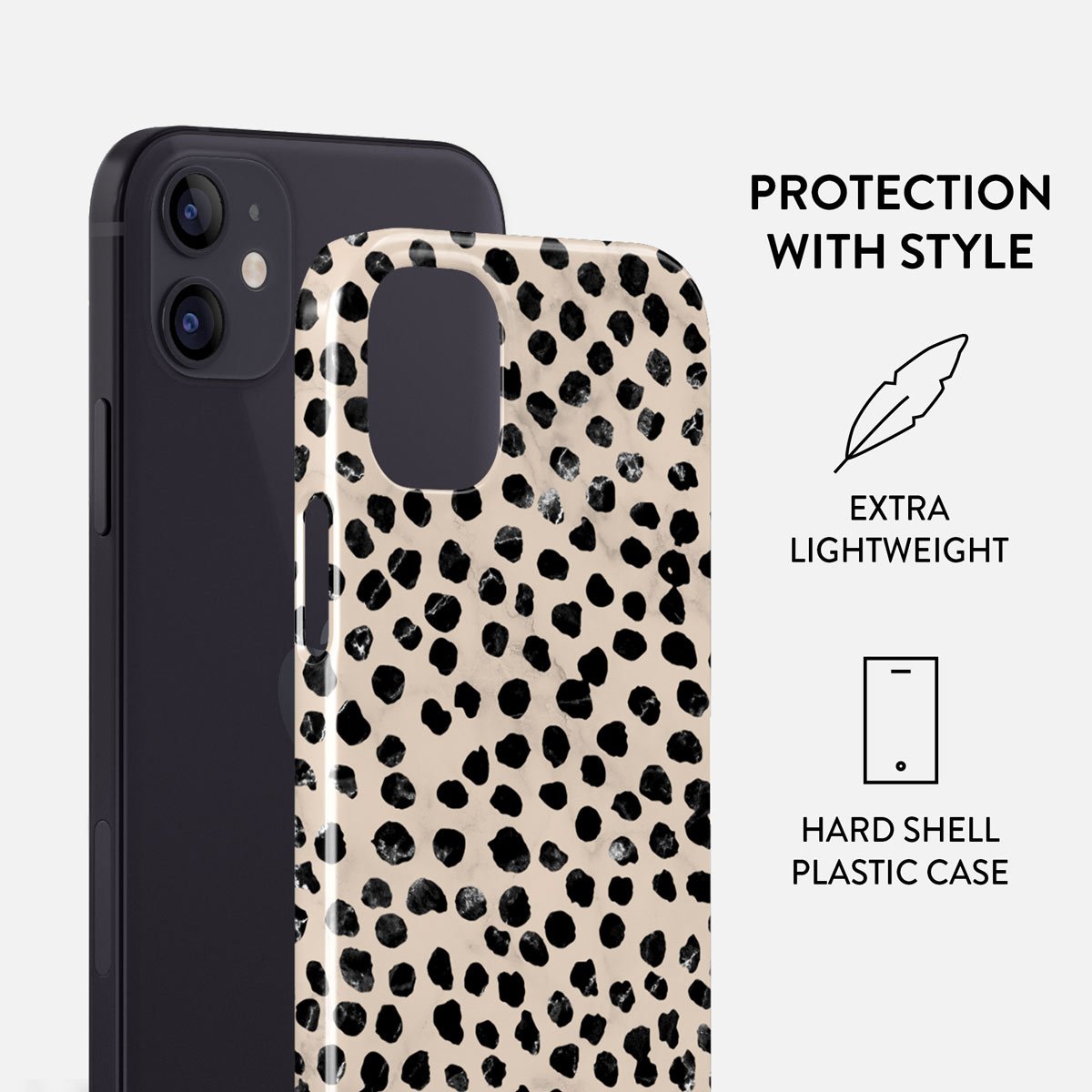 Cute cream color as a background for the unique pattern of asymmetrical black spots creates a real eye-catcher in our Almond Latte iPhone 12 Mini phone case. The spotted pattern adds a touch of luxury to your phone, while the case's hard-shell nature offers much-needed protection making it a popular choice between fashion lovers.