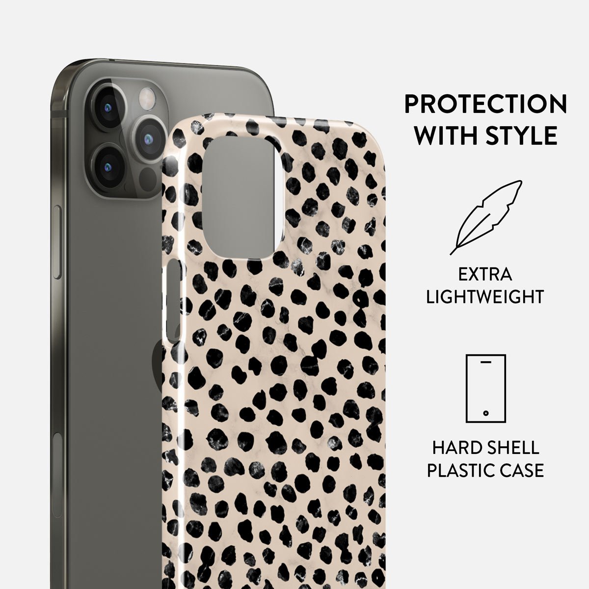 Cute cream color as a background for the unique pattern of asymmetrical black spots creates a real eye-catcher in our Almond Latte iPhone 12 Pro phone case. The spotted pattern adds a touch of luxury to your phone, while the case's hard-shell nature offers much-needed protection making it a popular choice between fashion lovers.