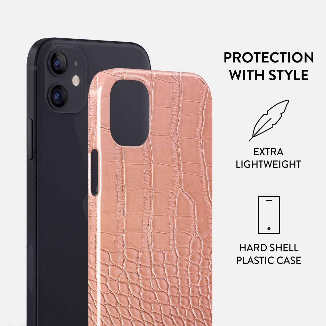 Our Pink Croco iPhone 12 Mini phone case features a classic crocodile design reimagined and showcased in a soft coral shade. The new take on the dangerous animal print will add a touch of softness to your style while simultaneously offering heavy-duty protection to your device.
