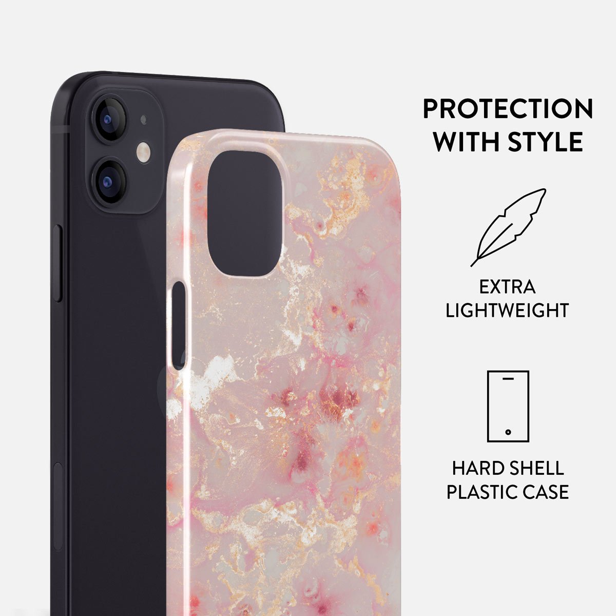 The sun is shining and creates a golden reflection in the corals. Take this scenery with yourself with our pretty and pink Golden Coral iPhone 12 Mini phone case. Add protection to your phone with a unique pink marble pattern that is guaranteed to catch everyone's eye.